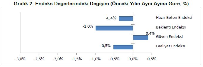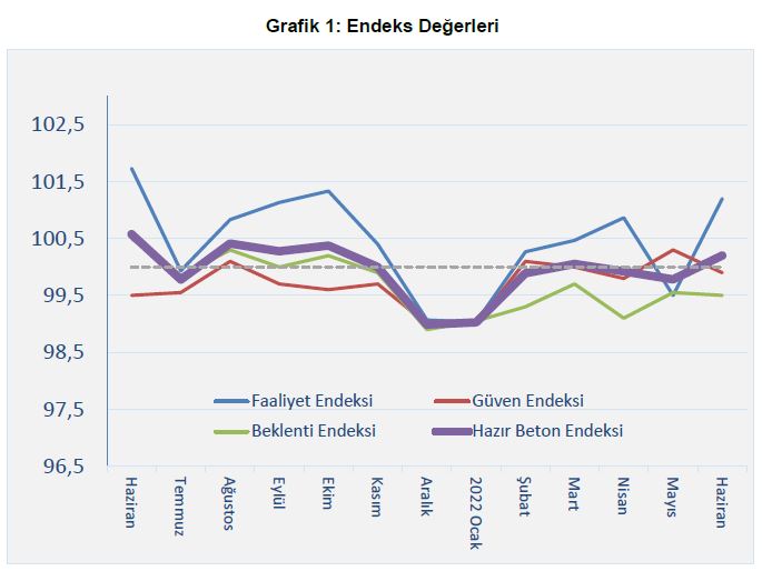 Raporda birleşik beton endeksinin faaliyetteki yükselme neticesinde yukarı yönlü hareket ettiği ve bu yılın en yüksek düzeyine çıktığı bilgisi yer aldı. Ayrıca faaliyet endeksinin haziran ayında yılın en yüksek düzeyine ulaşmasına rağmen, geçen yılın aynı ayına göre düştüğü göze çarparken, ekonomiye olan güvenin yükselmiş görünmesine rağmen beklentinin zayıflaması, inşaat sektörü özelinde olumlu bir senaryonun bu yıl için hâlen gerçekleşmediğini ortaya koydu. 3 endeksin bileşeni olan hazır beton endeksi de önceki yıla kıyasla düşüş gösterdi.