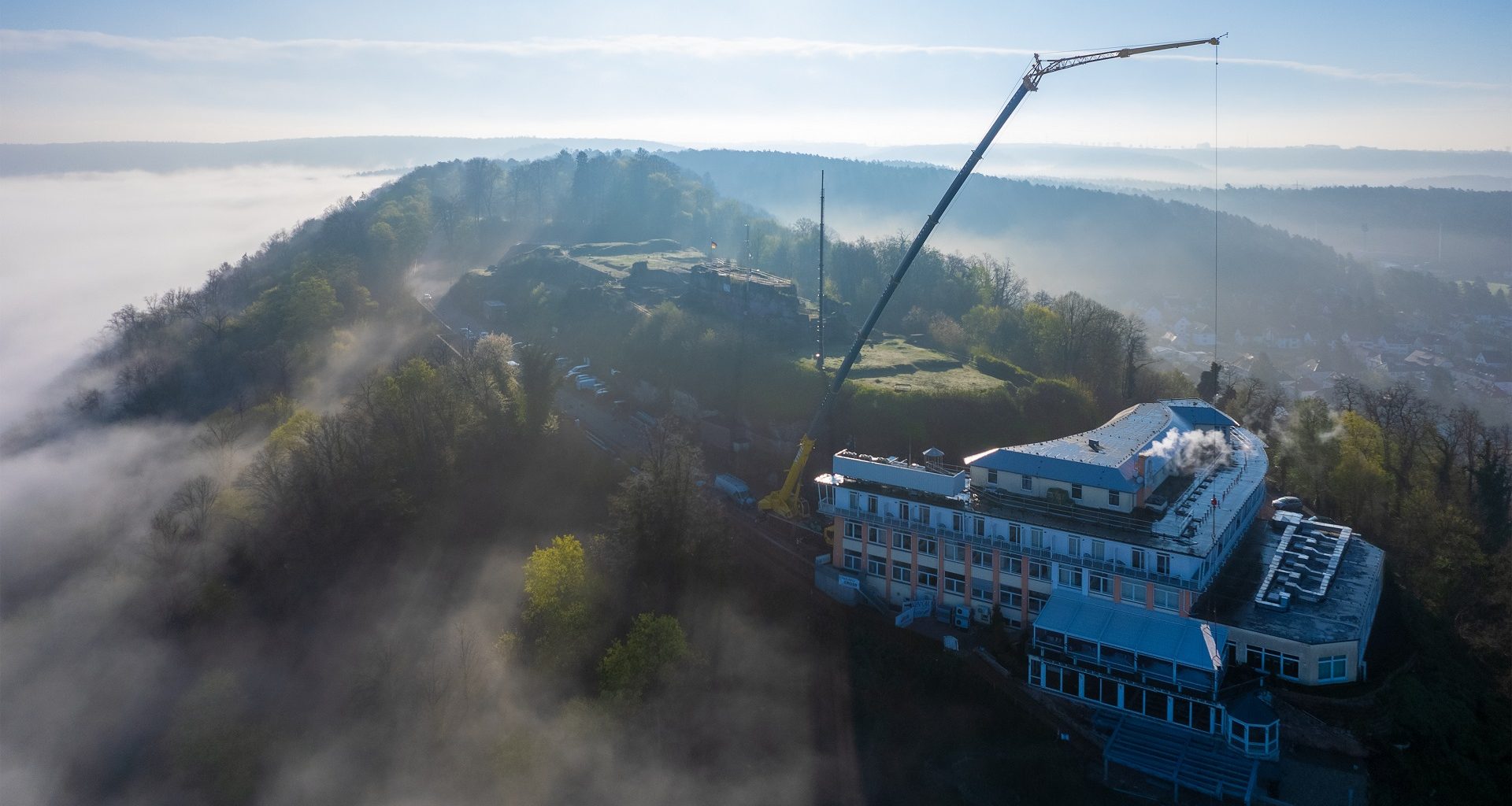 Homburg, Saarland’da Steil Kranarbeiten GmbH & Co KG şirketi, Liebherr LTM 1150-5.3 mobil vinç kullanarak Schlossberg Oteli’nin şantiyedeki inşaat çalışmaları sırasında açık kalmasını sağladı. Gerekli yük sınıfındaki başka hiçbir mobil vinç bu başarıya ulaşacak kadar kompakt bir yapıda çalışma sağlayamıyor. Konukların, tedarikçilerin ve hepsinden önemlisi acil durum araçlarının otele erişiminin her zaman garanti edilmesi gerekiyordu.