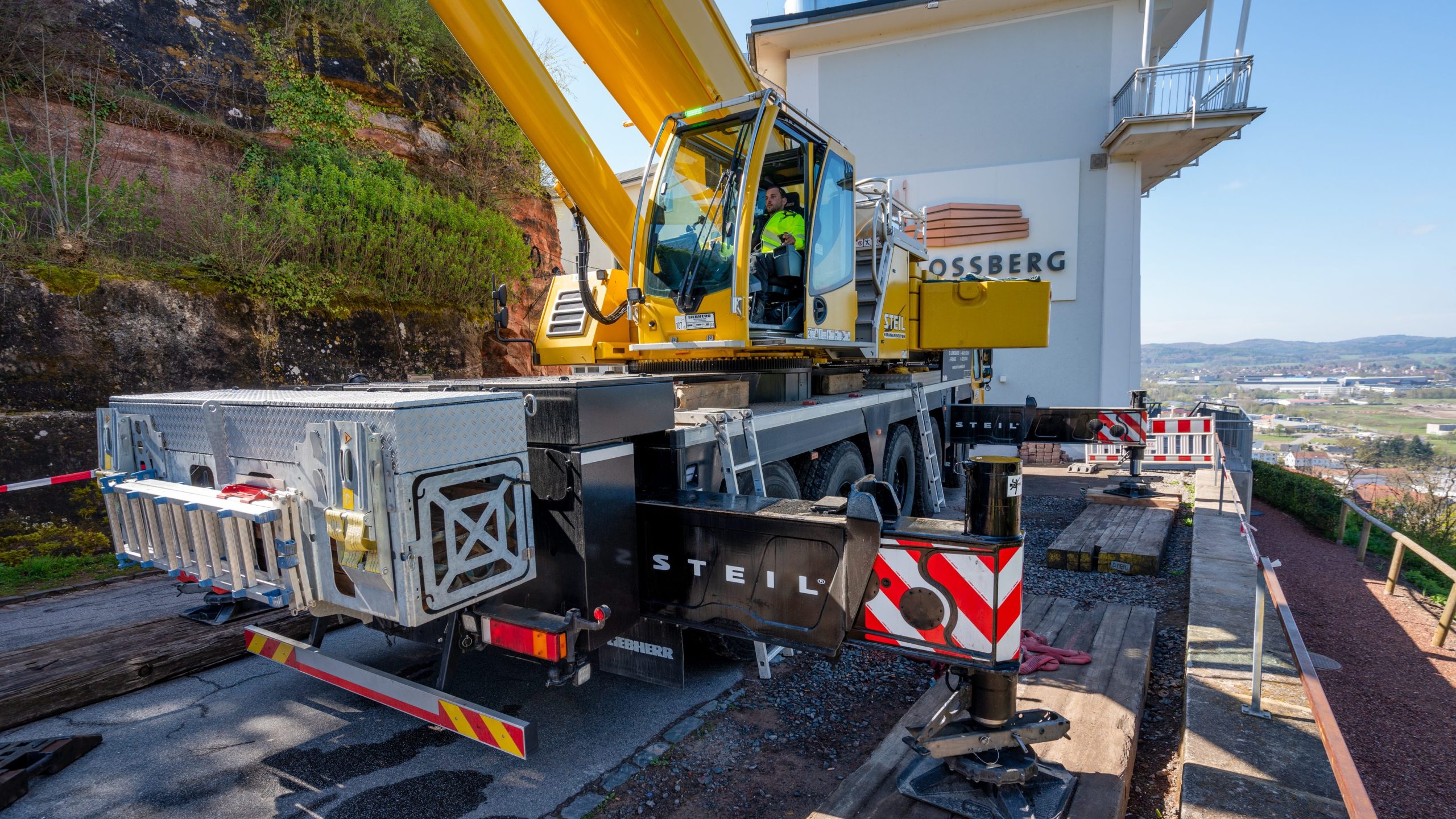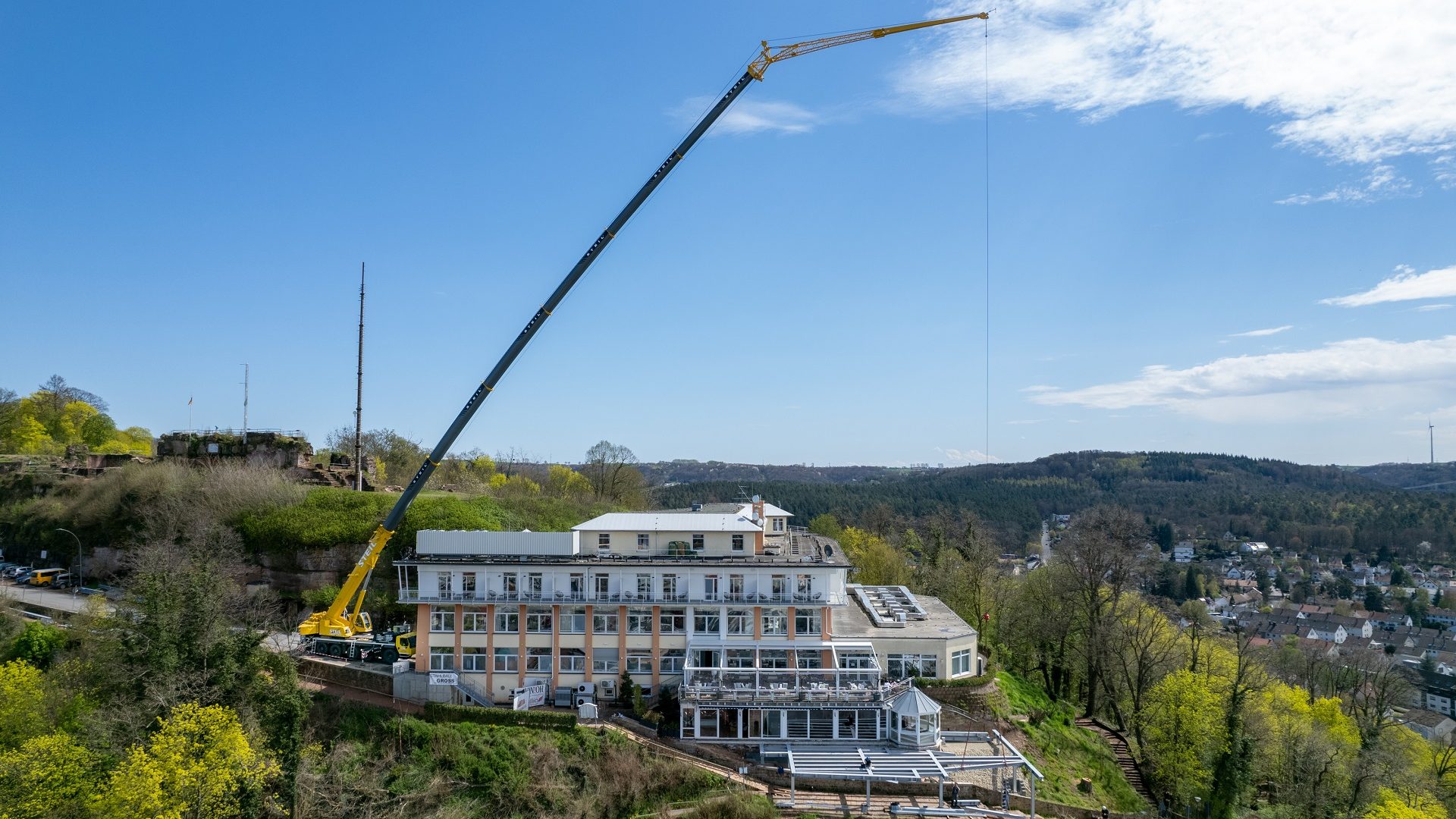 Homburg’daki Schlossberg’deki bir otel kompleksinde, 220 metrekarelik bir teras inşa etmek için önemli miktarda malzemenin binanın üzerinden kaldırılması ve karşı tarafa taşınması gerekiyordu. Ancak şantiyenin altından geçen 17. yüzyıldan kalma tüneller nedeniyle mobil vincin şantiyeye yakın konumlandırılması mümkün olmadı. Steil’in Saarwellingen Şubesi Başkanı Frank Nicklas konu hakkında şu detayları paylaştı: “LTM 1150-5.3 ile geniş yarıçapıyla bu gereksinimleri karşılayan ve aynı zamanda otel misafirleri ve teslimat araçları için yeterli alan bırakan mobil vince sahibiz.”