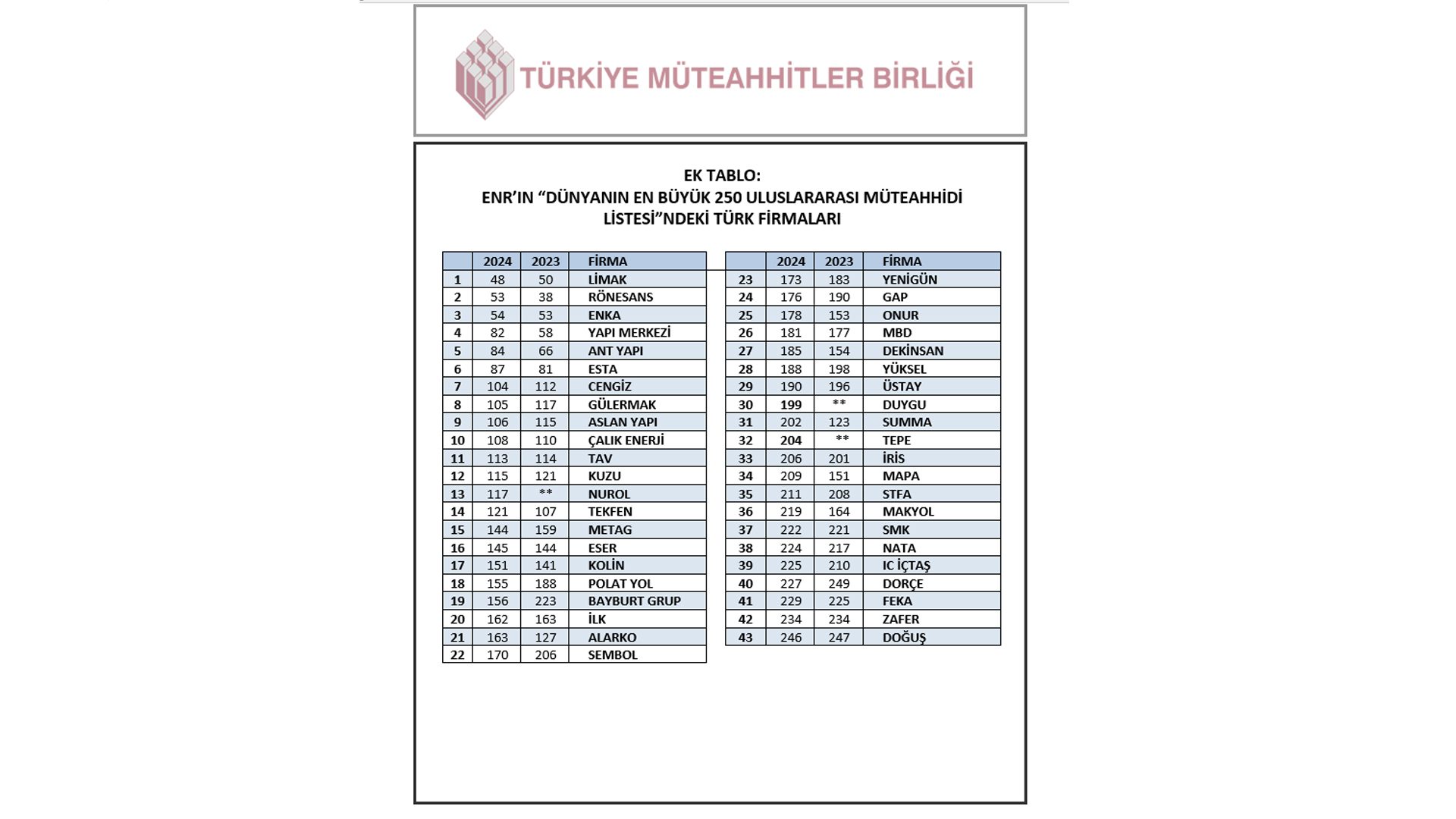 Global ölçekli yaşanan küresel zorluklara karşın Türkiye, 2023 yılındaki performansıyla bu yıl “Dünyanın En Büyük 250 Uluslararası Müteahhidi” listesinde 43 firma ile yer aldı. Böylece Türkiye, firma sayısına göre dünya ikinciliğini korudu. Listede 81 firmayla birinci yine Çin olurken, üçüncü sırada 38 firma ile ABD bulunuyor. Türkiye’nin küresel inşaat pazarından aldığı pay ise yüzde %3,7 olarak kaydedildi.