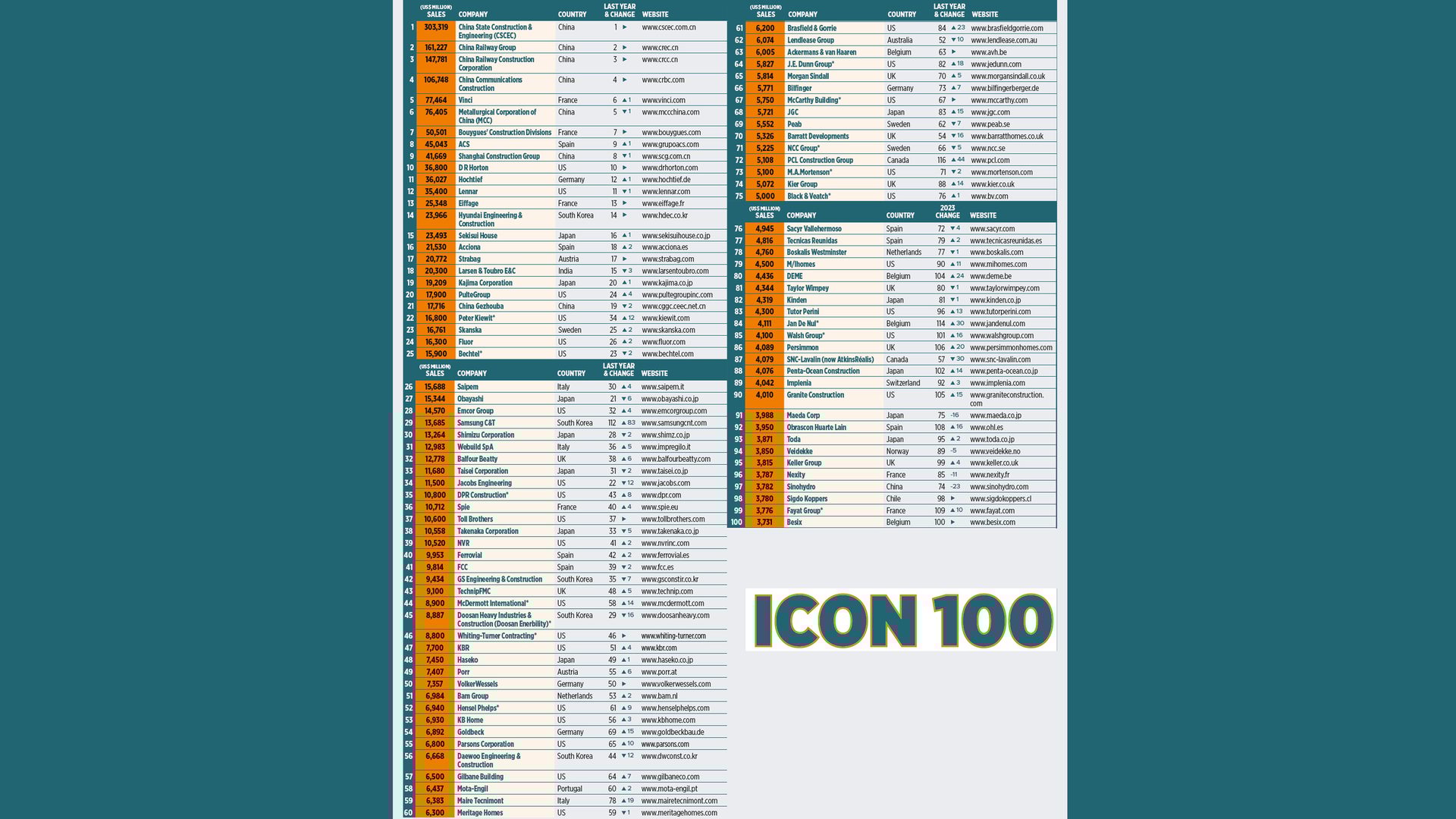 Lig tablosu, 2024 yılı satışlarına göre dünyanın en büyük inşaat şirketlerinin sıralamasıdır. Şirketlerin kendi muhasebe uygulamalarına göre tam veya kısmi mali yıl verileri kullanılır. Veriler denetlenmiş yıllık hesaplardan, şirketlerin kendi gelir beyanlarından ve güvenilir üçüncü taraf kaynaklardan (ör. Factiva) derlenmiştir. Bazı durumlarda ICON gelir tahmini yapmıştır ve bu durumlarda tahminler yıldız işaretiyle belirtilmiştir. Sıralama ABD doları cinsindendir; tüm para birimleri için döviz kurları hesaplanıp ortalama alınmıştır. ICON 100’deki bilgilerin doğruluğu için azami dikkat gösterilmekle birlikte, International Construction herhangi bir hata veya yanlışlık için sorumluluk kabul etmez.